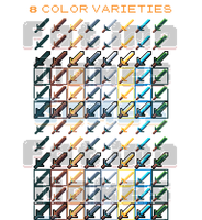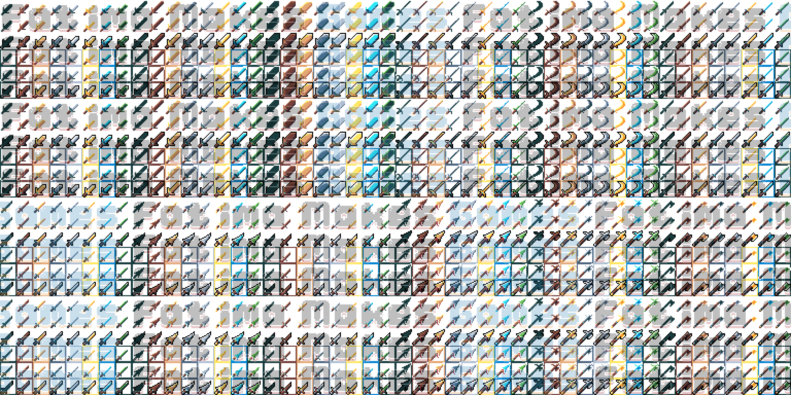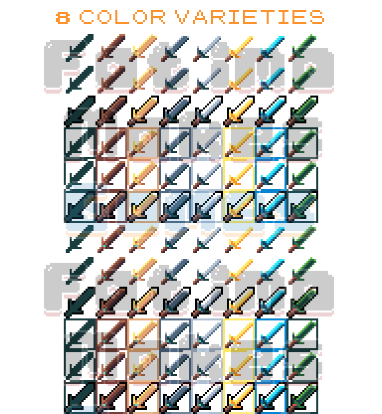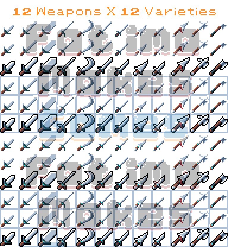 ⚔️ 12 iconic melee weapons × 8 materials × 12 presentation styles = 1152 hand-crafted pixel sprites