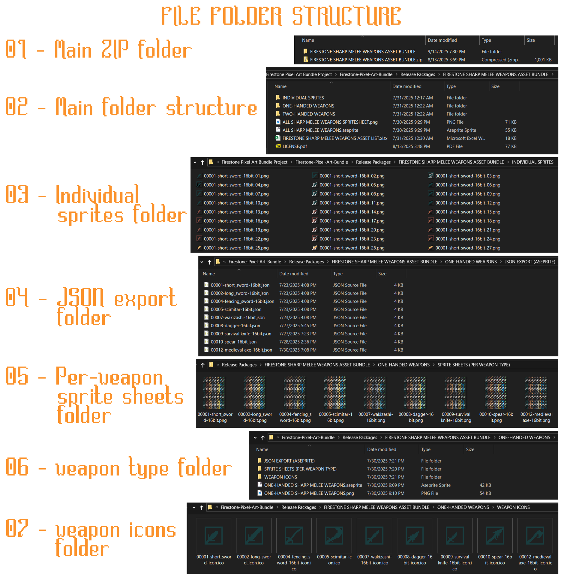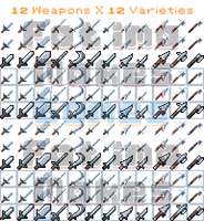 This marks the official release of the first asset pack in a hopefully long series of Firestone branded Fatima Makes Games assets packs. In this first one, 12 different sharp melee weapons were added, each with 12 different variations and 8 different rarity colors, totaling 1152 sprites!